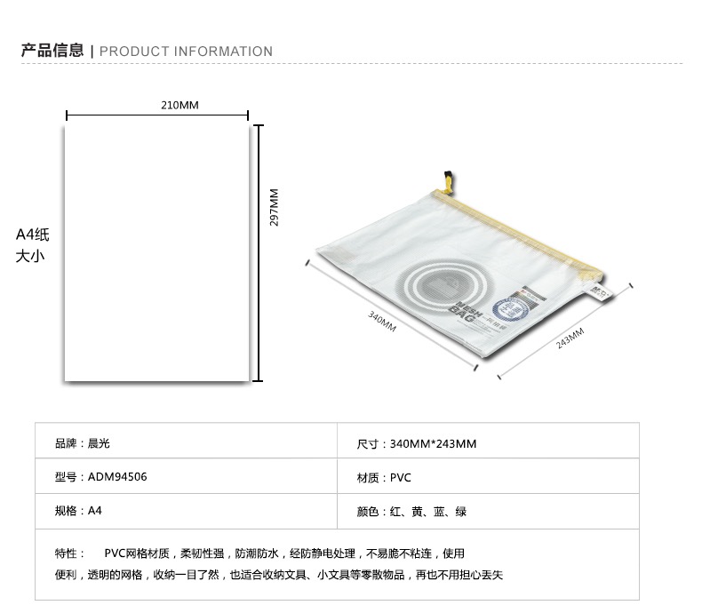 • 商品名称:晨光A4规格PVC拉链袋ADM94506