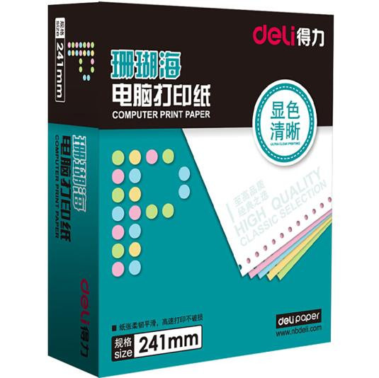 • 商品名称:得力(deli)珊瑚海彩色电脑打印纸S241-4CS四层80列(撕边 色序:白红蓝黄 1000页/箱)