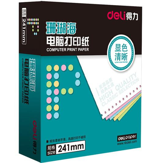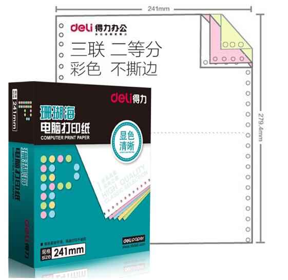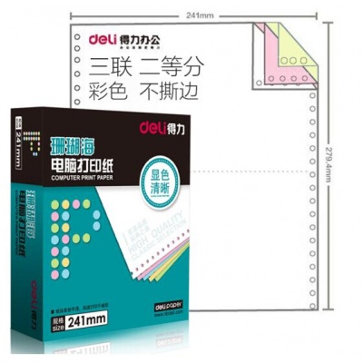 • 商品名称:得力(deli)珊瑚海彩色电脑打印纸S241-3-1/2C三层二等分80列(不撕边 色序:白红黄 1000页/箱)