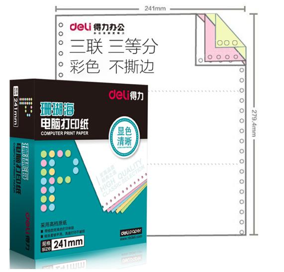 • 商品名称:得力(deli)珊瑚海彩色电脑打印纸S241-3-1/3C三层三等分80列(不撕边 色序:白红黄 1000页/箱)
