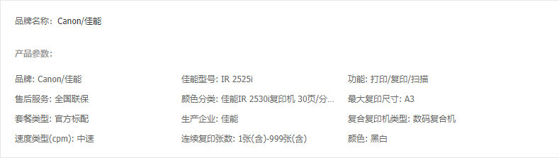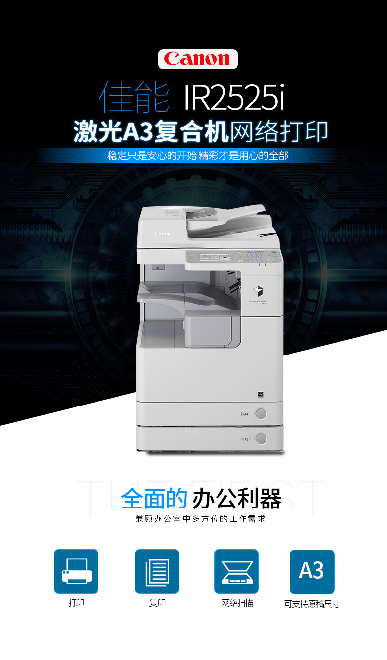 佳能iR2530i黑白复印机a3幅面 带输稿器 双面打印 复印 扫描 网络打印 支持ps打印 pcl打印 条形码打印 彩色多元发送组件