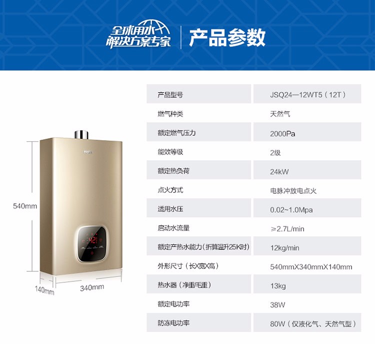 • 商品名称:Haier/海尔 燃气热水器 JSQ24-12WT5(12T)